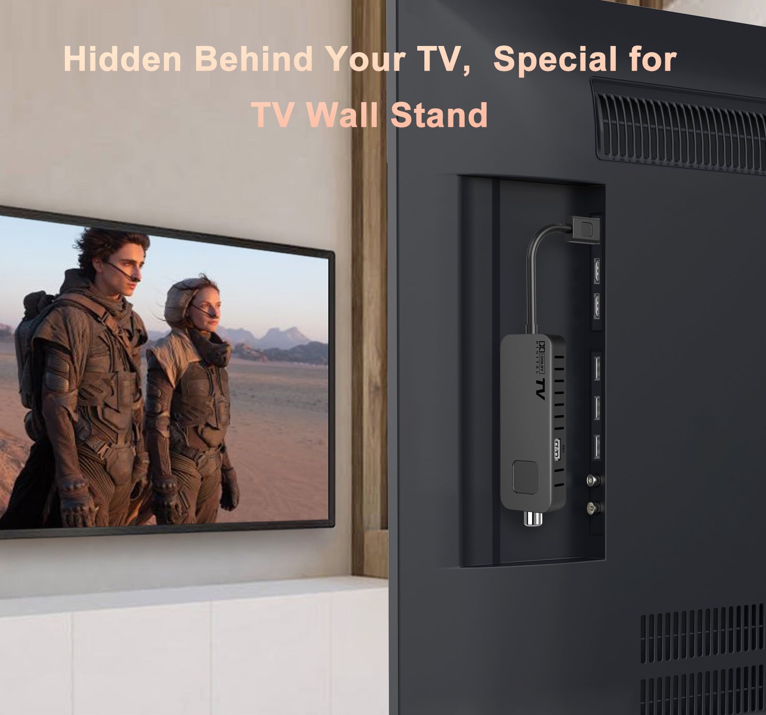 Design compatto particolarmente adatto per TV a parete, può essere appeso ovunque.Decoder per nuovo segnale TV.(DVB-T2/S2/C) Con telecomando di programmazione 2 in 1.